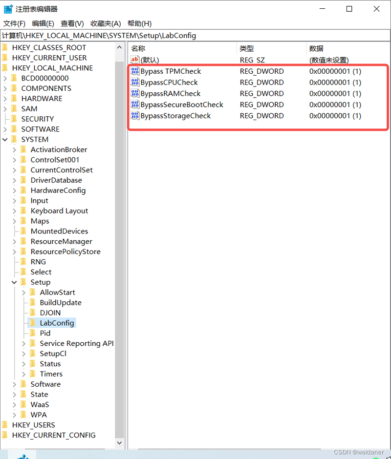 3、选中新建的 labconfig,在右边空白处,点右键 → 新建 → DWORD (32 位)值(D),创建两个DWORD值:BypassTPMCheck 和 BypassSecureBootCheck